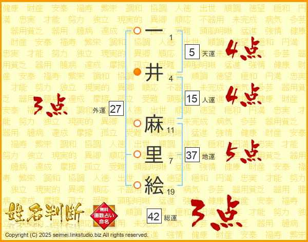 一(1画)井(4画) 麻(11画)里(7画)絵(19画)