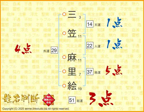 三(3画)笠(11画) 麻(11画)里(7画)絵(19画)