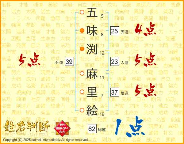 五(5画)味(8画)渕(12画) 麻(11画)里(7画)絵(19画)