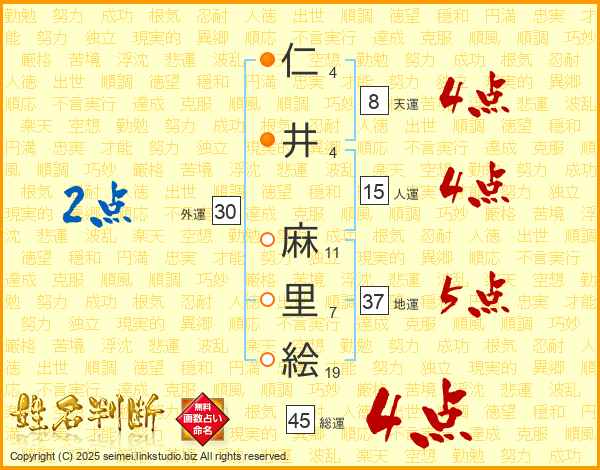 仁(4画)井(4画) 麻(11画)里(7画)絵(19画)