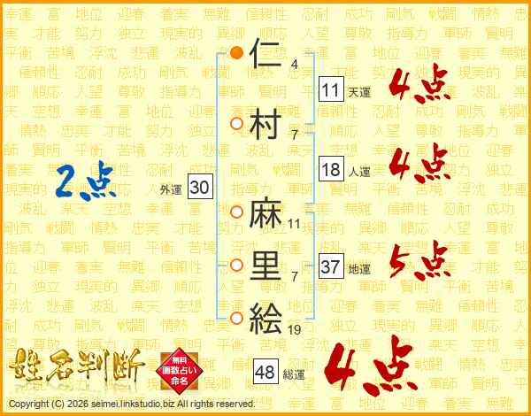 仁(4画)村(7画) 麻(11画)里(7画)絵(19画)