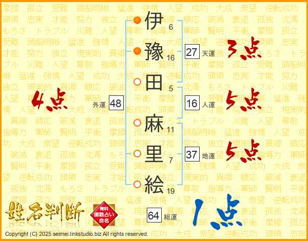 伊(6画)豫(16画)田(5画) 麻(11画)里(7画)絵(19画)