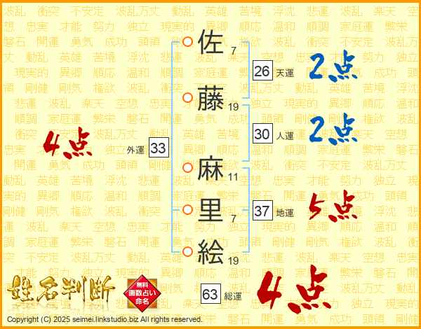 佐(7画)藤(19画) 麻(11画)里(7画)絵(19画)