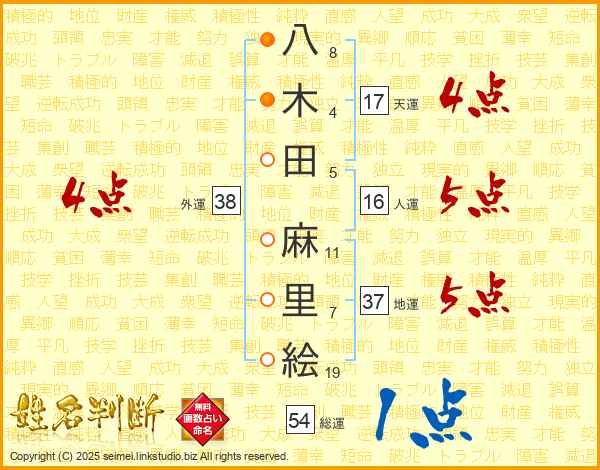 八(8画)木(4画)田(5画) 麻(11画)里(7画)絵(19画)