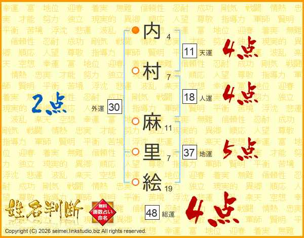 内(4画)村(7画) 麻(11画)里(7画)絵(19画)