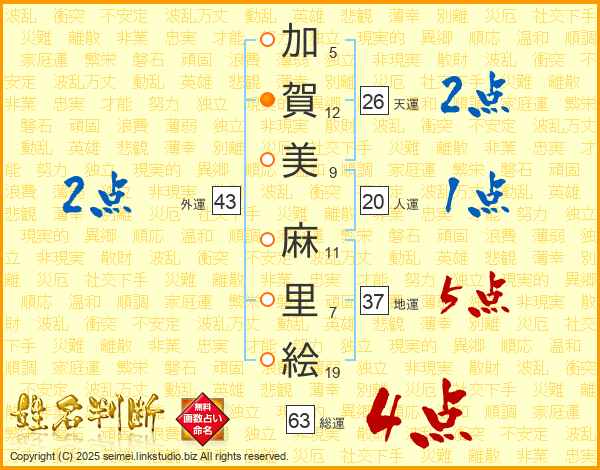 加(5画)賀(12画)美(9画) 麻(11画)里(7画)絵(19画)