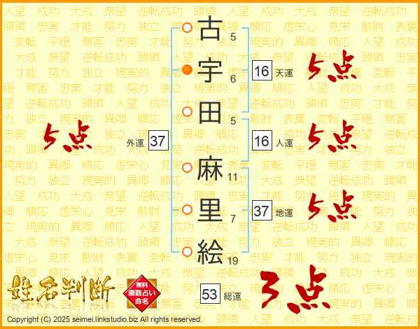 古(5画)宇(6画)田(5画) 麻(11画)里(7画)絵(19画)