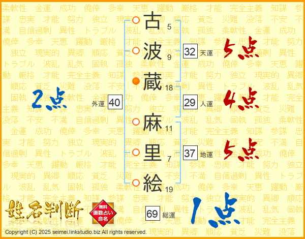 古(5画)波(9画)蔵(18画) 麻(11画)里(7画)絵(19画)