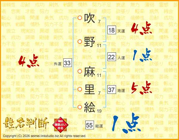 吹(7画)野(11画) 麻(11画)里(7画)絵(19画)