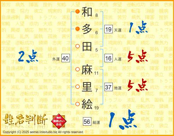 和(8画)多(6画)田(5画) 麻(11画)里(7画)絵(19画)
