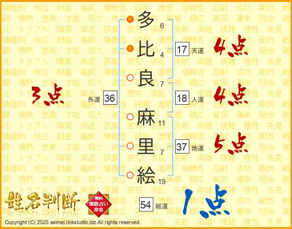 多(6画)比(4画)良(7画) 麻(11画)里(7画)絵(19画)