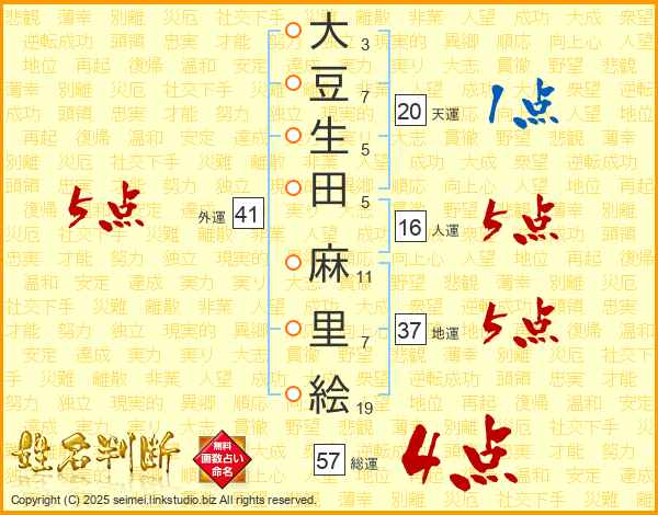 大(3画)豆(7画)生(5画)田(5画) 麻(11画)里(7画)絵(19画)