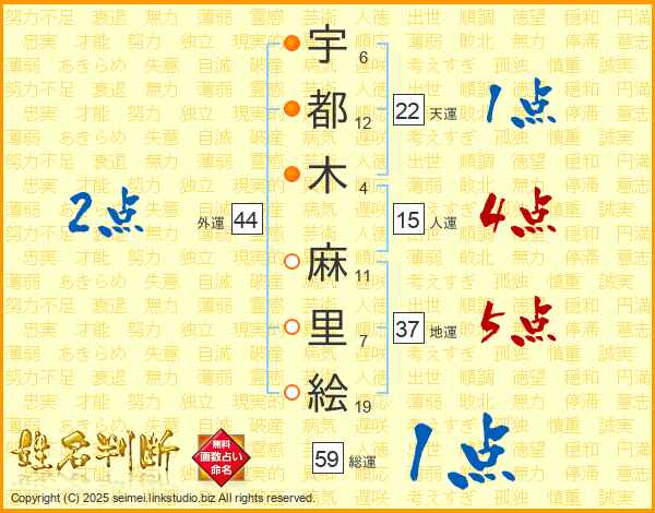宇(6画)都(12画)木(4画) 麻(11画)里(7画)絵(19画)