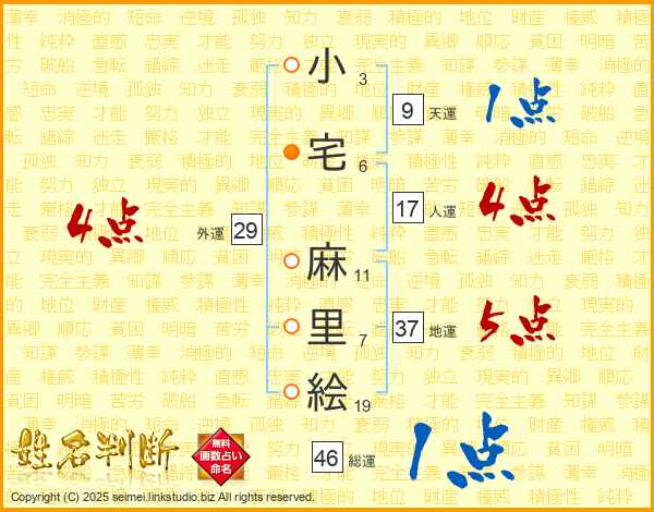 小(3画)宅(6画) 麻(11画)里(7画)絵(19画)