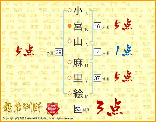 小宮山麻里絵さんの地運は37画の5点!