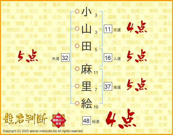 小(3画)山(3画)田(5画) 麻(11画)里(7画)絵(19画)