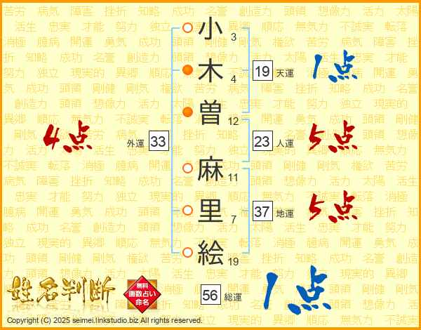 小(3画)木(4画)曽(12画) 麻(11画)里(7画)絵(19画)