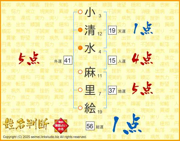 小(3画)清(12画)水(4画) 麻(11画)里(7画)絵(19画)