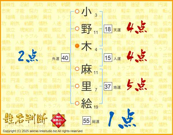小(3画)野(11画)木(4画) 麻(11画)里(7画)絵(19画)