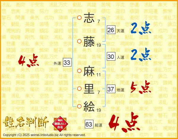 志(7画)藤(19画) 麻(11画)里(7画)絵(19画)