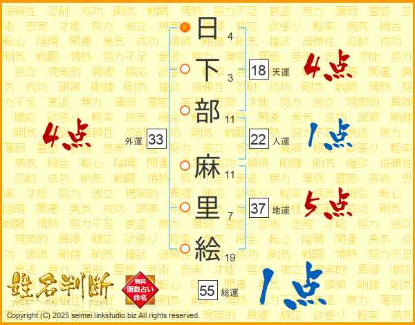 日(4画)下(3画)部(11画) 麻(11画)里(7画)絵(19画)