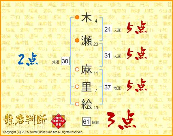 木瀬麻里絵さんの地運は37画の5点!