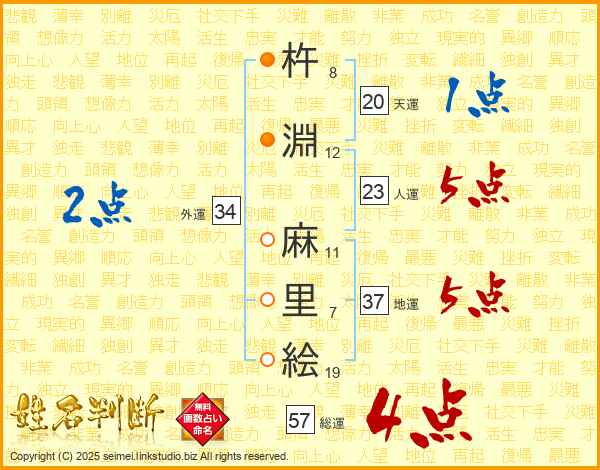 杵(8画)淵(12画) 麻(11画)里(7画)絵(19画)