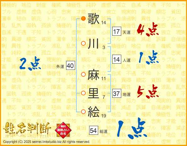 歌(14画)川(3画) 麻(11画)里(7画)絵(19画)