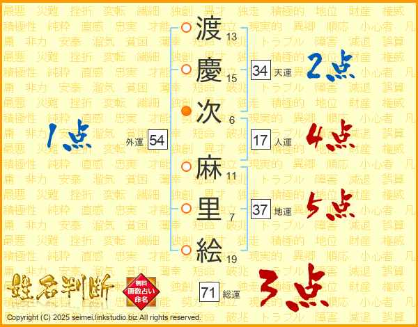渡(13画)慶(15画)次(6画) 麻(11画)里(7画)絵(19画)