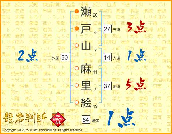 瀬(20画)戸(4画)山(3画) 麻(11画)里(7画)絵(19画)