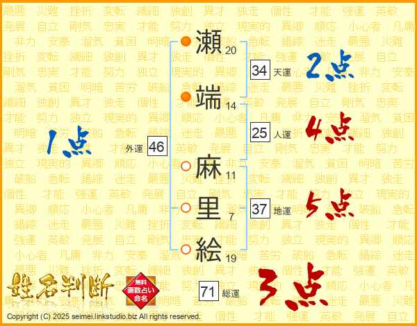瀬(20画)端(14画) 麻(11画)里(7画)絵(19画)