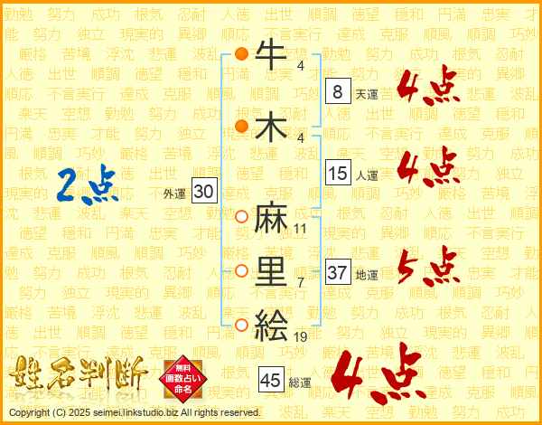 牛(4画)木(4画) 麻(11画)里(7画)絵(19画)