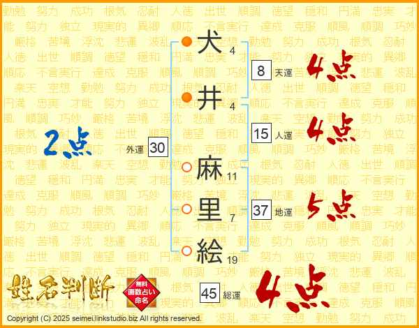 犬(4画)井(4画) 麻(11画)里(7画)絵(19画)