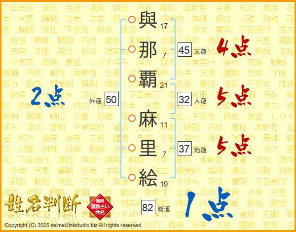 與(17画)那(7画)覇(21画) 麻(11画)里(7画)絵(19画)