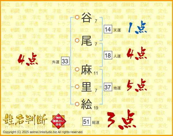 谷(7画)尾(7画) 麻(11画)里(7画)絵(19画)