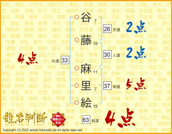 谷(7画)藤(19画) 麻(11画)里(7画)絵(19画)