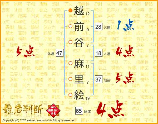 越(12画)前(9画)谷(7画) 麻(11画)里(7画)絵(19画)