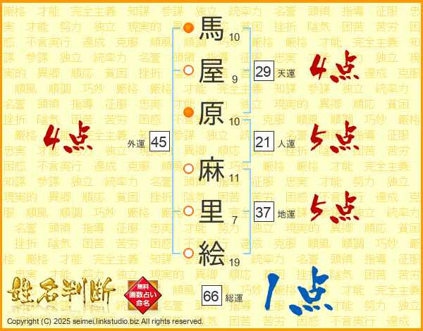 馬(10画)屋(9画)原(10画) 麻(11画)里(7画)絵(19画)