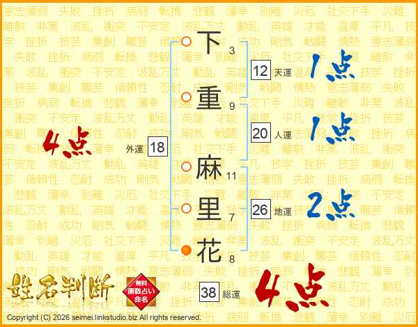 下(3画)重(9画) 麻(11画)里(7画)花(8画)