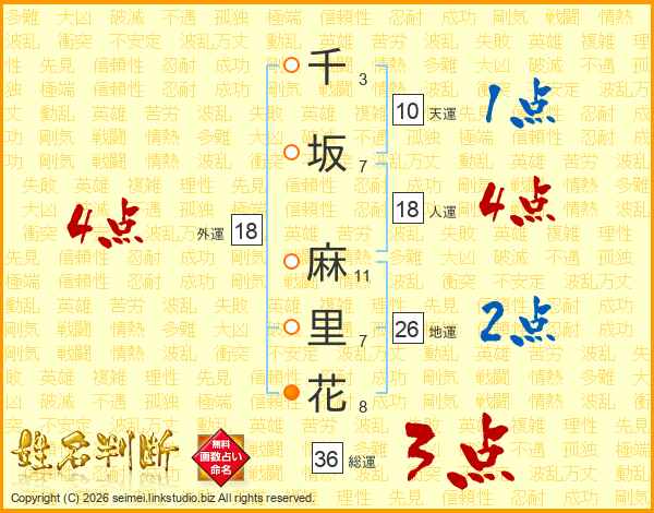 千(3画)坂(7画) 麻(11画)里(7画)花(8画)