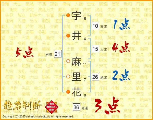 宇(6画)井(4画) 麻(11画)里(7画)花(8画)