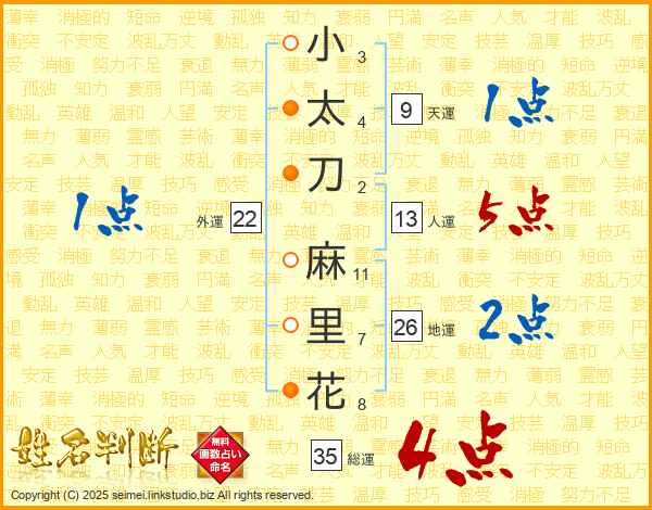 小(3画)太(4画)刀(2画) 麻(11画)里(7画)花(8画)