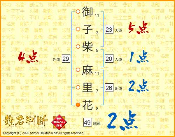 御(11画)子(3画)柴(9画) 麻(11画)里(7画)花(8画)