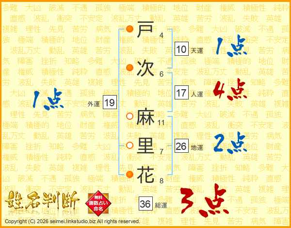 戸(4画)次(6画) 麻(11画)里(7画)花(8画)