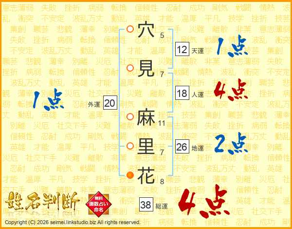 穴(5画)見(7画) 麻(11画)里(7画)花(8画)