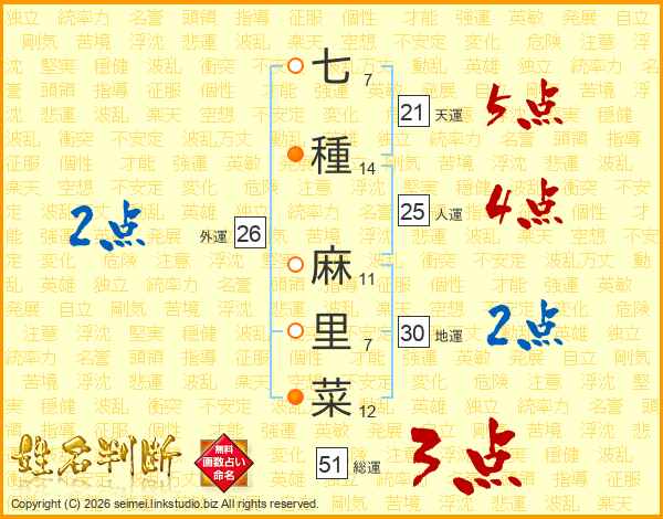 七(7画)種(14画) 麻(11画)里(7画)菜(12画)