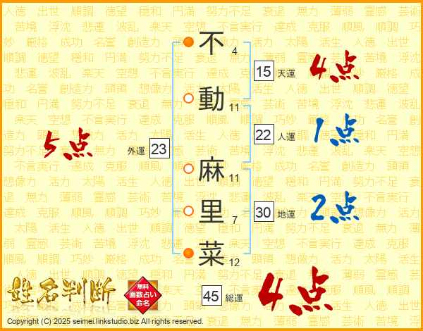 不(4画)動(11画) 麻(11画)里(7画)菜(12画)