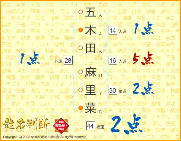 五(5画)木(4画)田(5画) 麻(11画)里(7画)菜(12画)