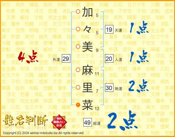 加(5画)々(5画)美(9画) 麻(11画)里(7画)菜(12画)