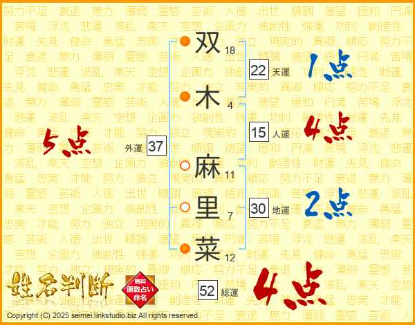 双(18画)木(4画) 麻(11画)里(7画)菜(12画)